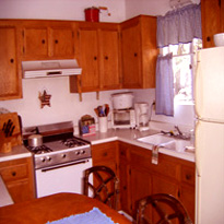 Kitchen has an oven, stove, toaster, refrigerator, microwave, coffee maker, pots, pans, plates, silverware, a set of knives and a chopping board. There is cell phone reception but no Wi-Fi or cable.